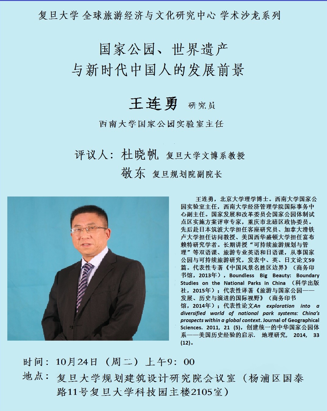 王连勇教授结合自身的长期研究积累,讨论了旅游与自然环境保护、国家公园与生态文明建设等议题,他指出旅游经济就是共享经济,共有、共建、共享自然和历史文化遗产是旅游经济的应有之义。在生态文明的顶层设计下,构建多样化的国家公园体系是建